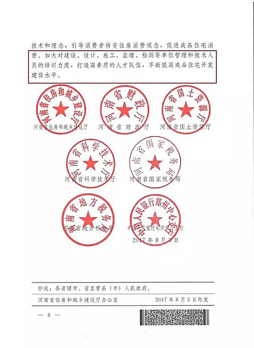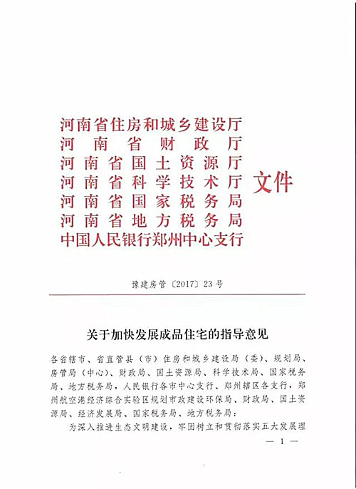 近日,河南省(sheng)住(zhu)房(fang)和城鄉建設廳、財(cai)政廳、國(guo)土資(zi)源廳、科(ke)學(xue)技術廳、河南省(sheng)國(guo)家稅務局、地方稅務、中(zhong)國(guo)人(ren)民銀行鄭州中(zhong)心支行共同下發《關于加快發展成(cheng)品住(zhu)宅的(de)指導意見》,其中(zhong)規定2018年(nian)1月1日起(qi)河南省(sheng)新(xin)建住(zhu)宅全為成(cheng)品房(fang)即精裝(zhuang)房(fang)。