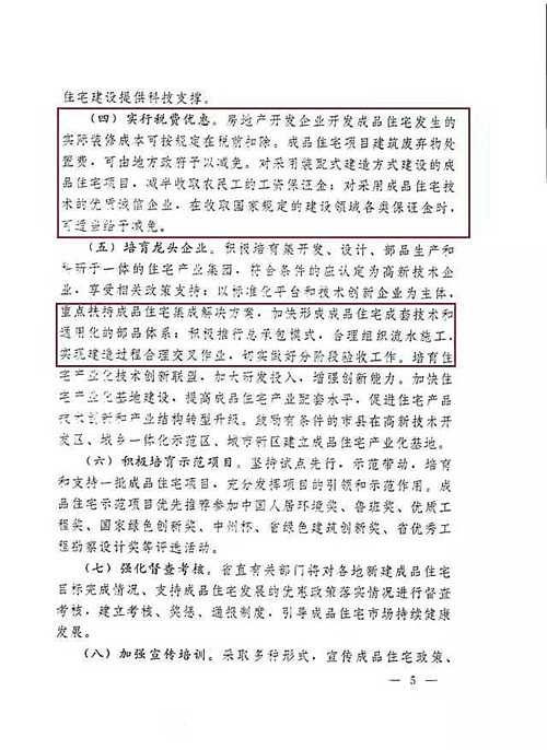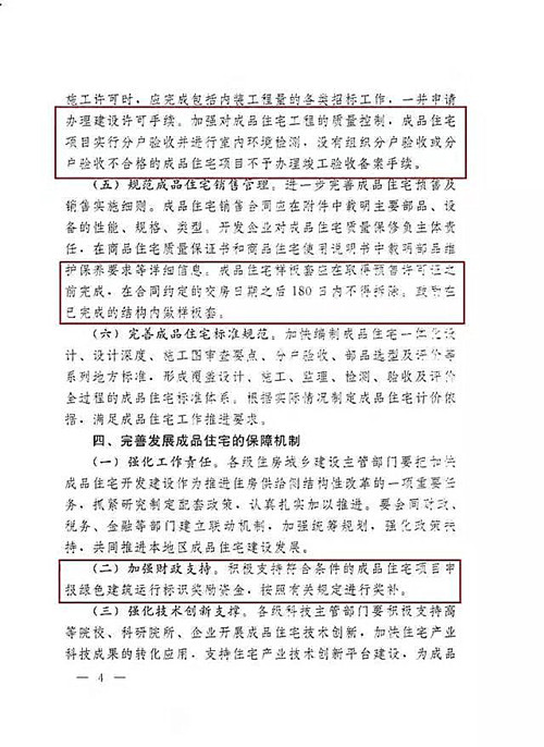 3、房地產企業開發成(cheng)品(pin)住宅(zhai)發生的實際(ji)裝修成(cheng)本可按(an)規定在(zai)稅前扣(kou)除;對采用成(cheng)品(pin)住宅(zhai)技術的優質誠信企業,在(zai)收取國(guo)家規定的建(jian)設領域各類保證金時,可適(shi)當(dang)給予減免;成(cheng)品(pin)住宅(zhai)示范項(xiang)目優先推薦參加中國(guo)人(ren)居環境獎、魯(lu)班獎、優質工程獎等(deng)評選活動。