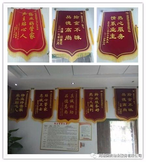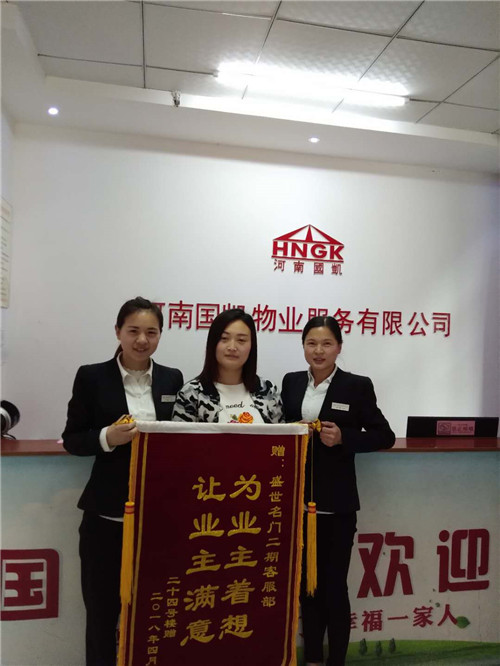 “為業主著想,讓業主滿意”幾個燙金大字(zi),在鮮(xian)艷的錦旗上閃(shan)閃(shan)發(fa)光,原來(lai)是國凱物業公(gong)司(si)服務的,盛世名(ming)門二期的業主,因為長期以(yi)來(lai),受到物管(guan)人(ren)(ren)員的高標準服務、人(ren)(ren)性化管(guan)理而(er)感(gan)動(dong),這(zhe)次(ci),更是特意送來(lai)錦旗。