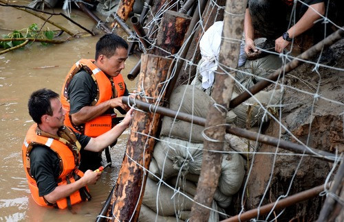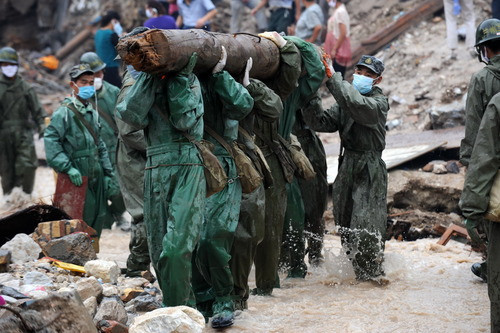 2010年8月7日,甘肅(su)省甘南州舟曲縣發(fa)生特大滑(hua)坡(po)泥石流災(zai)害,這是8月12日,解放軍戰士在雨后清(qing)理(li)泄洪道