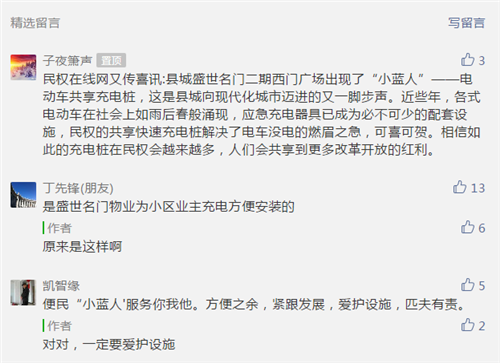 2月26日,我在盛世名門二期西門廣場看到,不少群眾在“嘗鮮”使用“小藍人”共享充電樁為自個兒的電車進行充電。“用這個充電樁充電又快又方便,以后出街電車就不怕沒有電了。”享受到“小藍人”帶來便利的群眾韋女士告訴小編,“小藍人”不僅便利了電車一族,避免出現路上推車的“尷尬”,還消除了類似于在出租屋內拉插座充電的消防安全隱患,解決了充電需求問題。