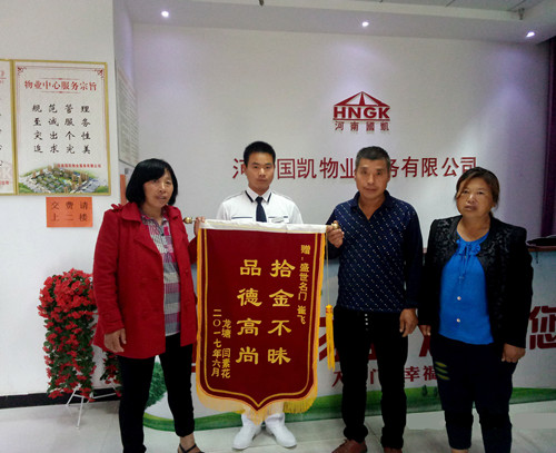 “拾金不昧,道德高尚(shang)”幾個燙金大字(zi)隨著業主(zhu)龍(long)塘和(he)閆素華的笑(xiao)聲和(he)感(gan)(gan)謝聲映入眼簾(lian),原(yuan)來他們二(er)位(wei)是公司服務小區(qu)盛世名(ming)門二(er)期的業主(zhu),因(yin)為(wei)長期以來物業公司的高標準服務、人(ren)性化管理而感(gan)(gan)動(dong),這次,更是因(yin)為(wei)物業公司保(bao)安部(bu)保(bao)安員崔飛同(tong)志的拾金不昧而送來錦旗。